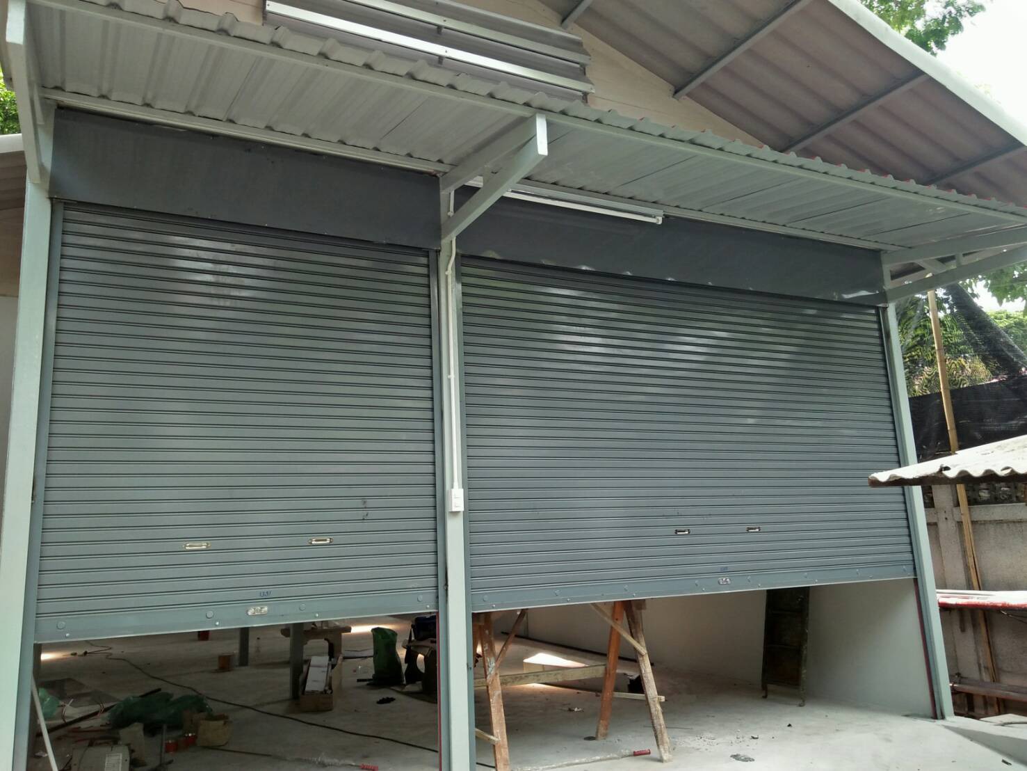 ประตูม้วน ระบบมือดึง มีเสาแบ่ง พ่นสีเทา หน้างาน: โรงเก็บอุปกรณ์ รพ. มิชชั่น